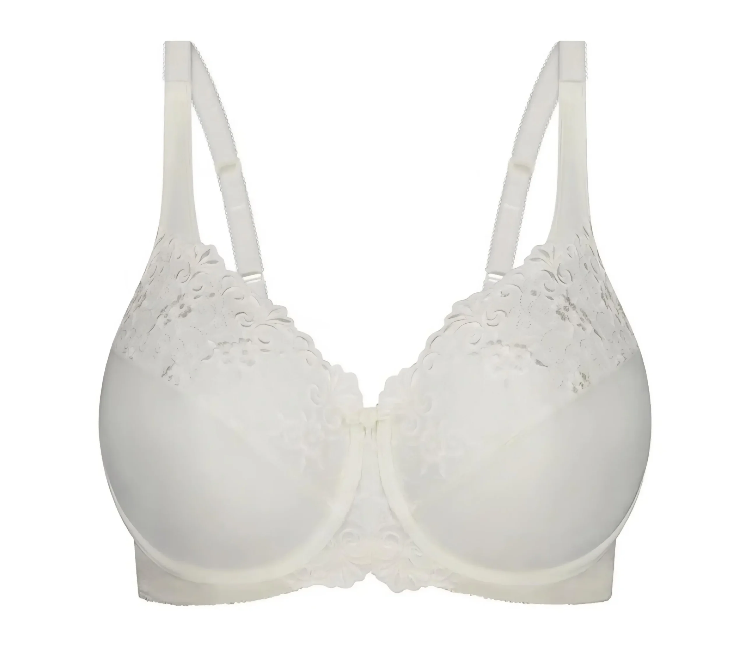 Triumph Embroidered Minimiser UW Bra. Minimise your bust by up to one cup size in this best selling minimiser bra. Triumph’s famous Embroidered Minimiser features firm, rigid fabric which holds the bust in and prevents unflattering strain across the front of tailored tops. Pretty embroidery adorns the top cup and centre front. A strong powernet at back provides support.